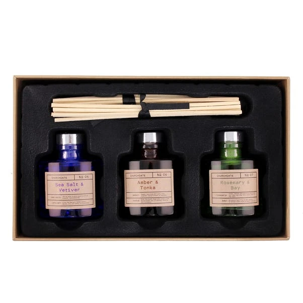 Crafted in colourful glass bottles, this set of three mini wardrobe diffusers are each infused with a refreshing scent and presented in an attractive gift box.