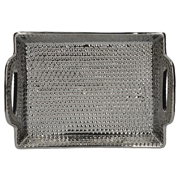 Beautifully decorated with an electroplated finish, this silver ceramic tray features dimple pattern design and two handles for convenience.