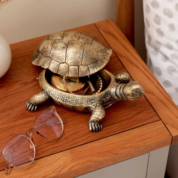 Add a unique and fun touch to any room with this multi-functional Luxe Traveller Tortoise Glasses Holder. Crafted with a gold resin finish and beautiful artistic details, the tortoise shell opens up so it can be used as a trinket box as well as a glasses holder, making it the perfect statement piece in any room.