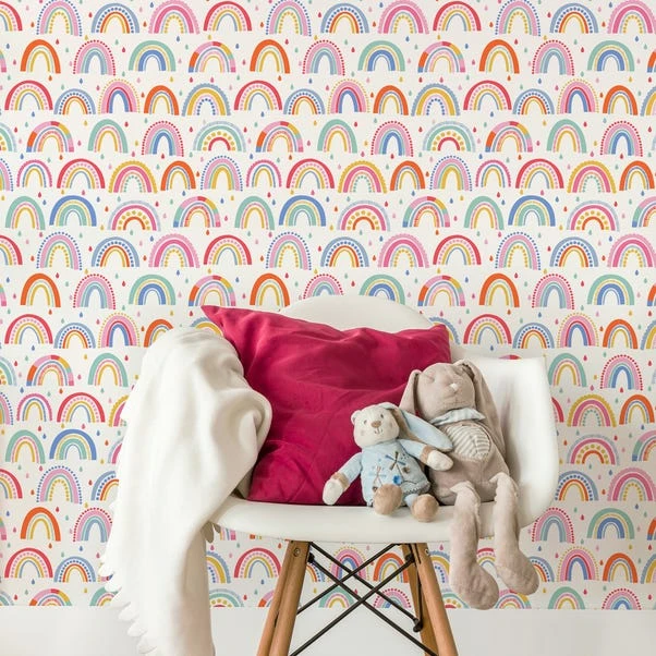 This on trend kids’ wallpaper has a matt finish and multicoloured rainbow print design which repeats every 53cm.