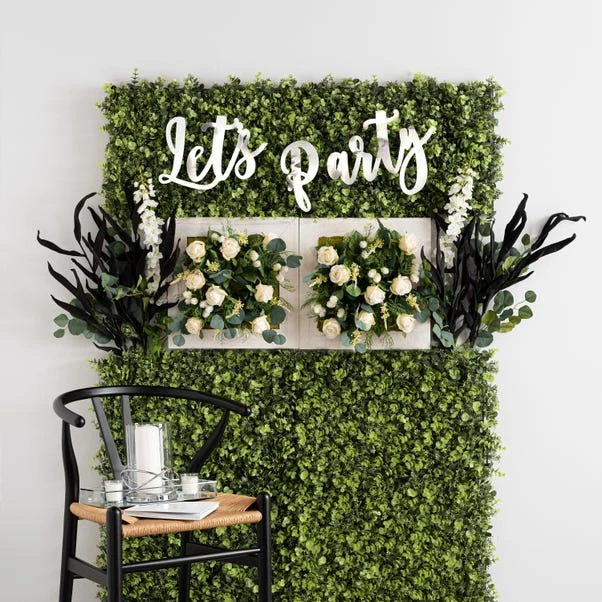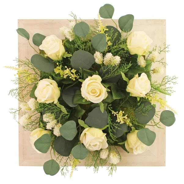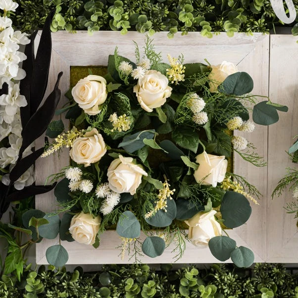 Ideal for wedding décor, this rustic white painted wooden frame with traditional florals features cream roses and dollar eucalyptus. Designed for easy display, using the hangers on the back, this piece can be matched with the range of co-ordinating traditional wedding florals.