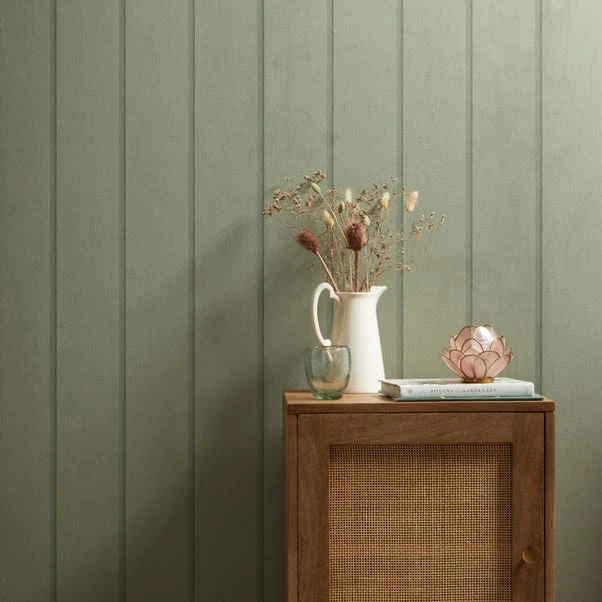 Bring a classic wood panel to your home with this stylish, on trend wallpaper. Featuring a stunning sage colourway, this wallpaper is ideal for a feature wall. Easy to apply, just paste the paper!