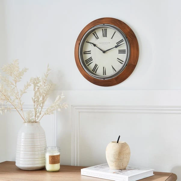 This wood-edged circular wall clock features chunky black Roman numerals set against a cream background.