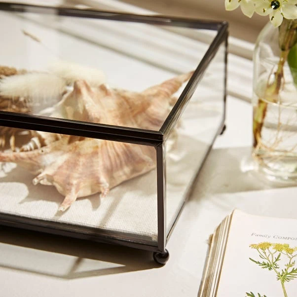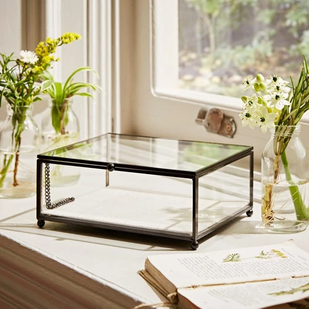 Display all your treasures in this simple and beautiful small trinket box, crafted with a black metal frame and clear glass. Perfect for storing a range of accessories, this stunning trinket box includes a fabric insert for more precious items and is easy to wipe clean. With a timeless design, this trinket box will complement an array of home decors beautifully. Inspired by the fabulous Museum building itself, and the display cabinets within.